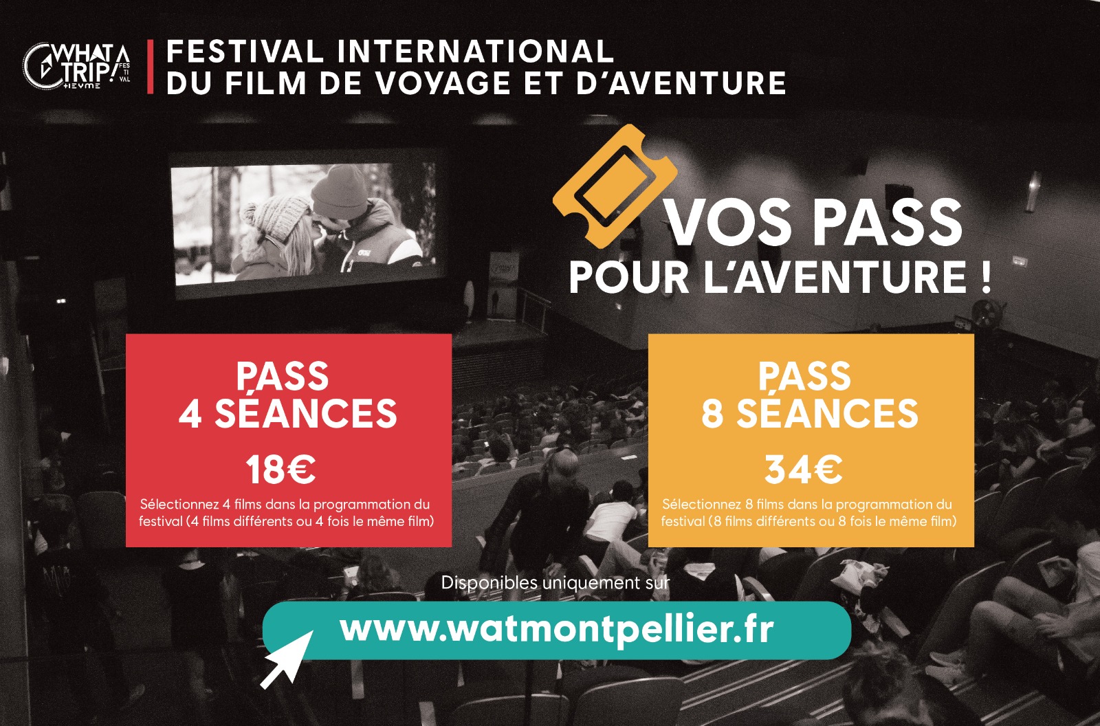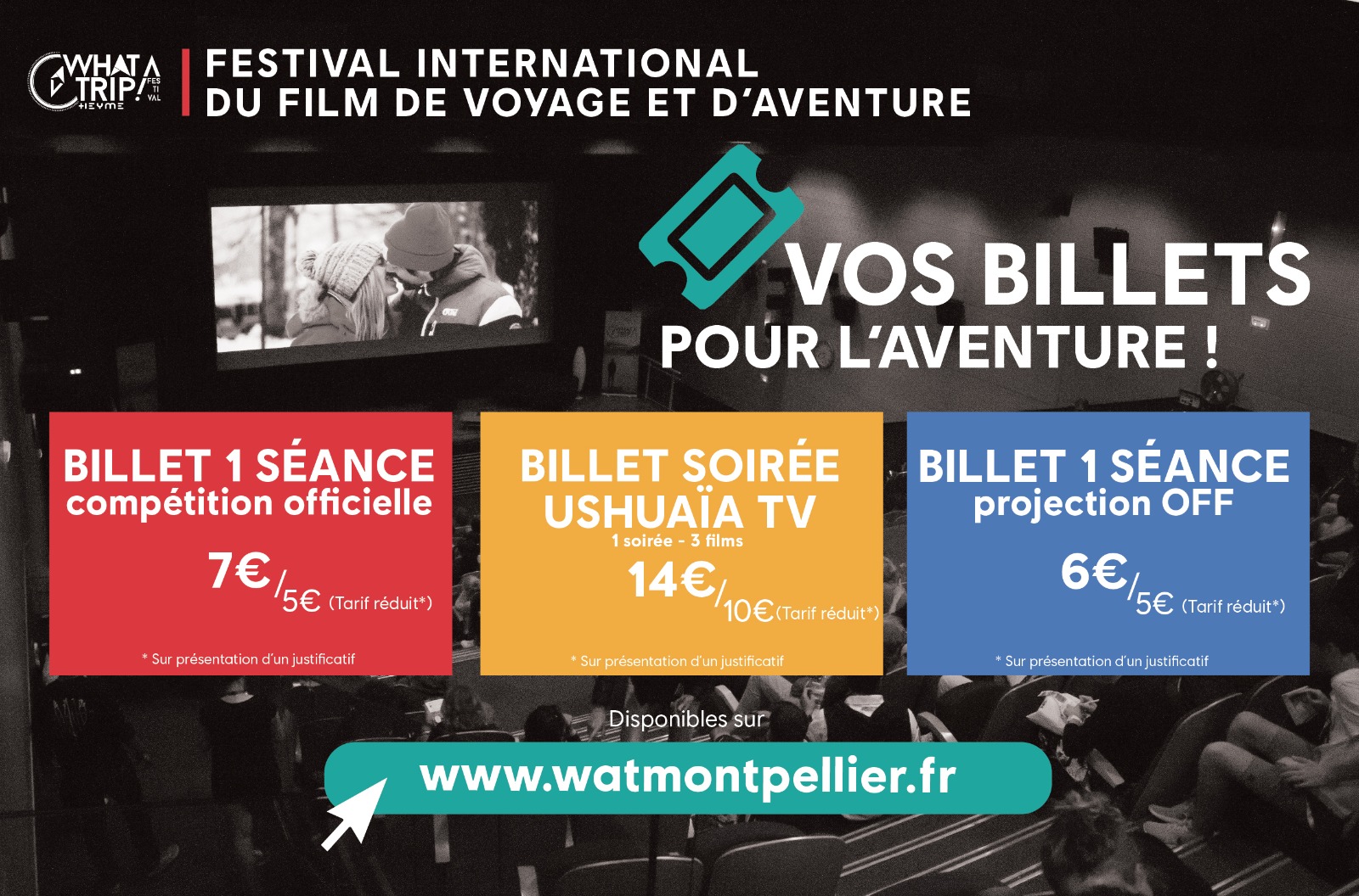 A la séance ou en packs, différentes options vous sont proposées pour embarquer dans le festival ! Du billet une séance (7€ en tarif plein) au pack 8 séances (34€), concevez votre séjour sur le festival comme bon vous semble ! Seul ou entre amis, What A Trip ! se dessine selon vos envies !